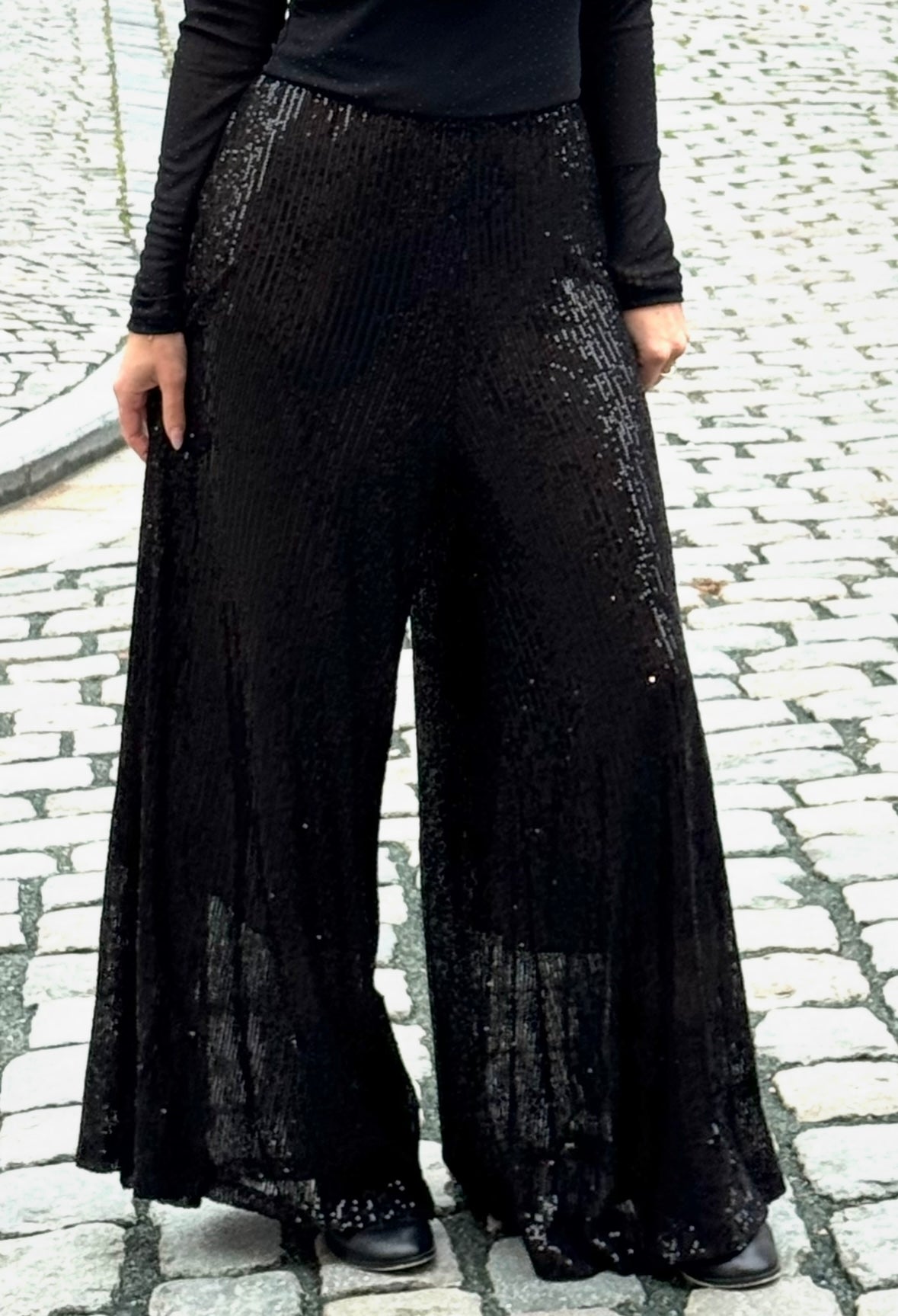 Diese elegante Palazzo-Hose mit funkelnden Pailletten sorgt für einen glamourösen Auftritt – ob zu festlichen Anlässen, Partys oder stilvollen Abendlooks.