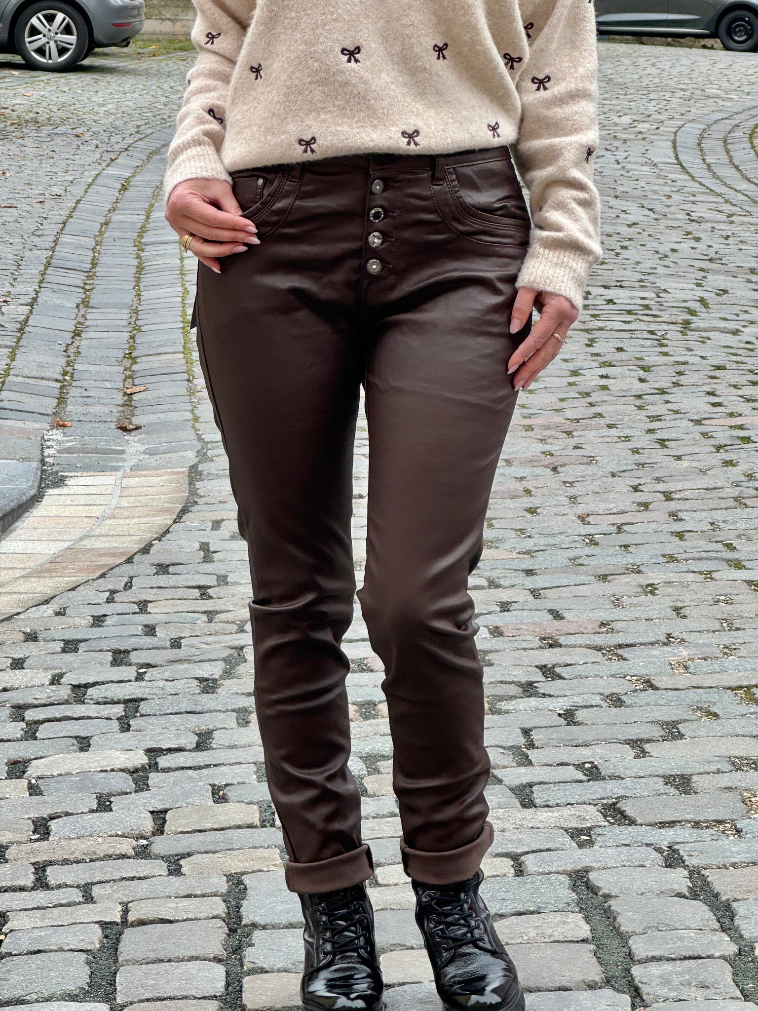 Diese Hose in edlem Dunkelbraun begeistert mit ihrem modernen Lederimitat-Look und einer schmalen Passform. Das weiche, beschichtete Material bietet einen angenehmen Tragekomfort und formt eine feminine Silhouette. Der elegante Knopfverschluss mit mehreren Knöpfen setzt ein stilvolles Detail und macht die Hose zu einem echten Hingucker.