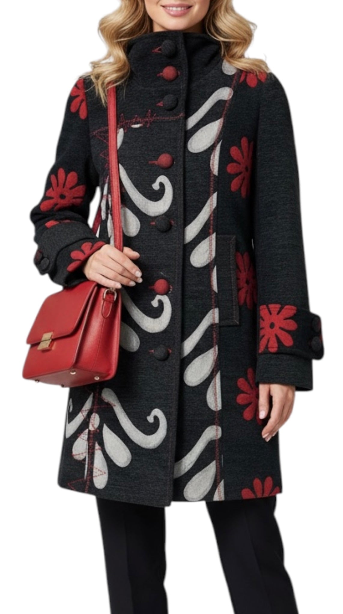 Dieser hochwertige Mantel besticht durch sein außergewöhnliches Design und eine feminine, stilvolle Ausstrahlung. Die Kombination aus dunkelgrauer Grundfarbe und dekorativen roten sowie weißen Musterelementen – darunter florale Motive und geschwungene Ornamente – macht ihn zu einem echten Blickfang.