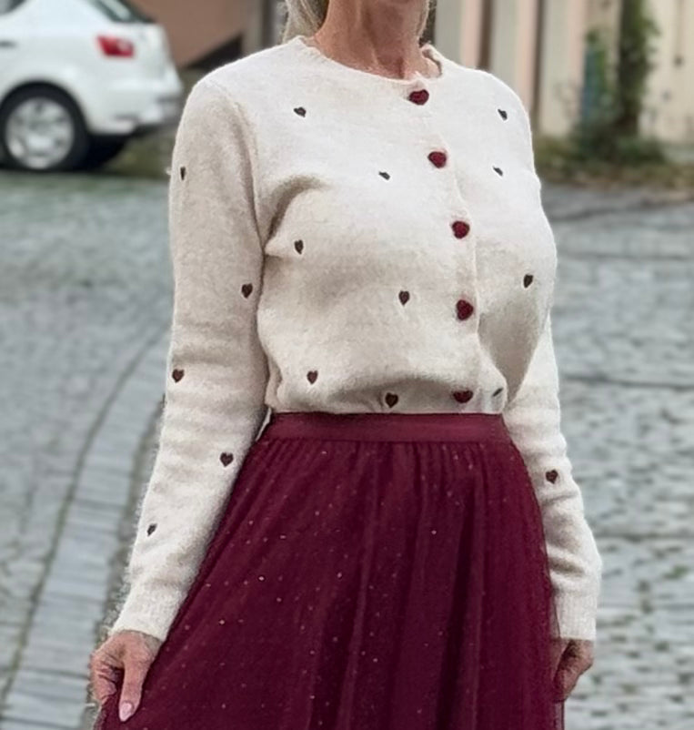 Diese süße Strickjacke ist ein echter Blickfang! Mit den kleinen Herzchen-Knöpfen und dem kuscheligen Materialmix sorgt sie für einen femininen und zugleich gemütlichen Look. Perfekt kombinierbar zu Jeans, Röcken oder Kleidern.
