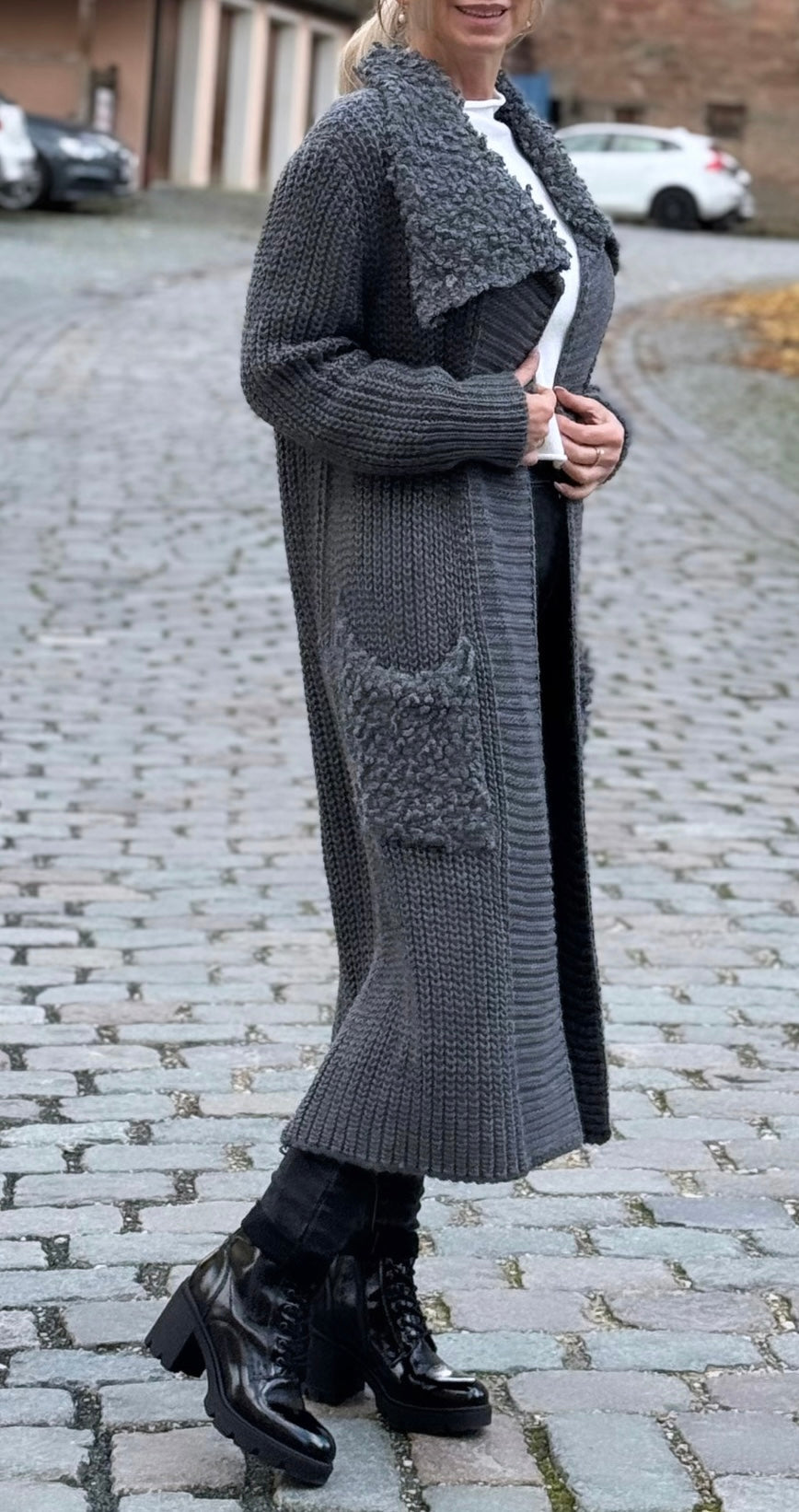 Dieser kuschelig-weiche Strickmantel überzeugt durch seine hochwertige Verarbeitung und den modernen, zeitlosen Schnitt. Der strukturierte Schalkragen sowie die aufgesetzten Taschen mit Bouclé-Details verleihen dem Mantel eine besondere Optik.