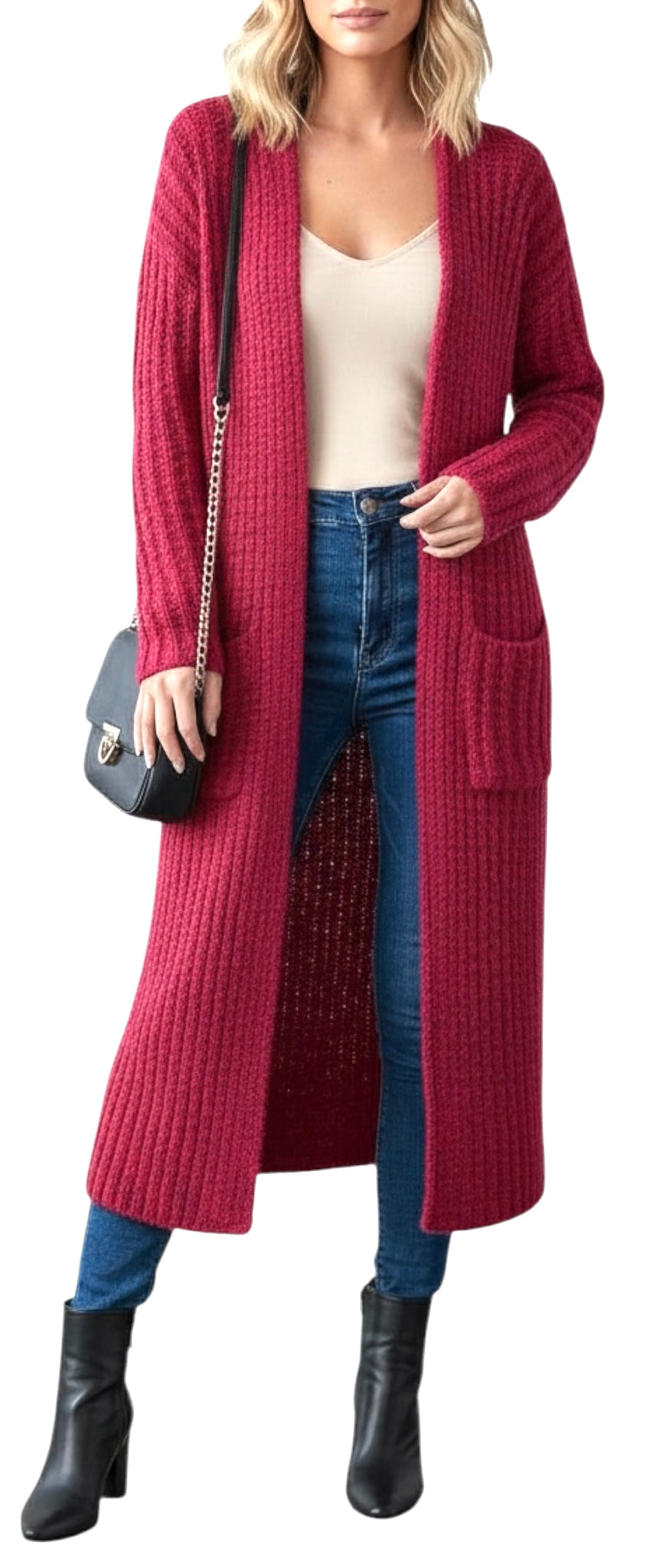 Diese lange, kuschelige Strickjacke ist der perfekte Begleiter für kühle Tage und sorgt sofort für einen stilvollen, modernen Look. Die offene Form, der lange Schnitt und die weiche Strickstruktur machen sie zu einem vielseitigen Must-have für jede Garderobe.