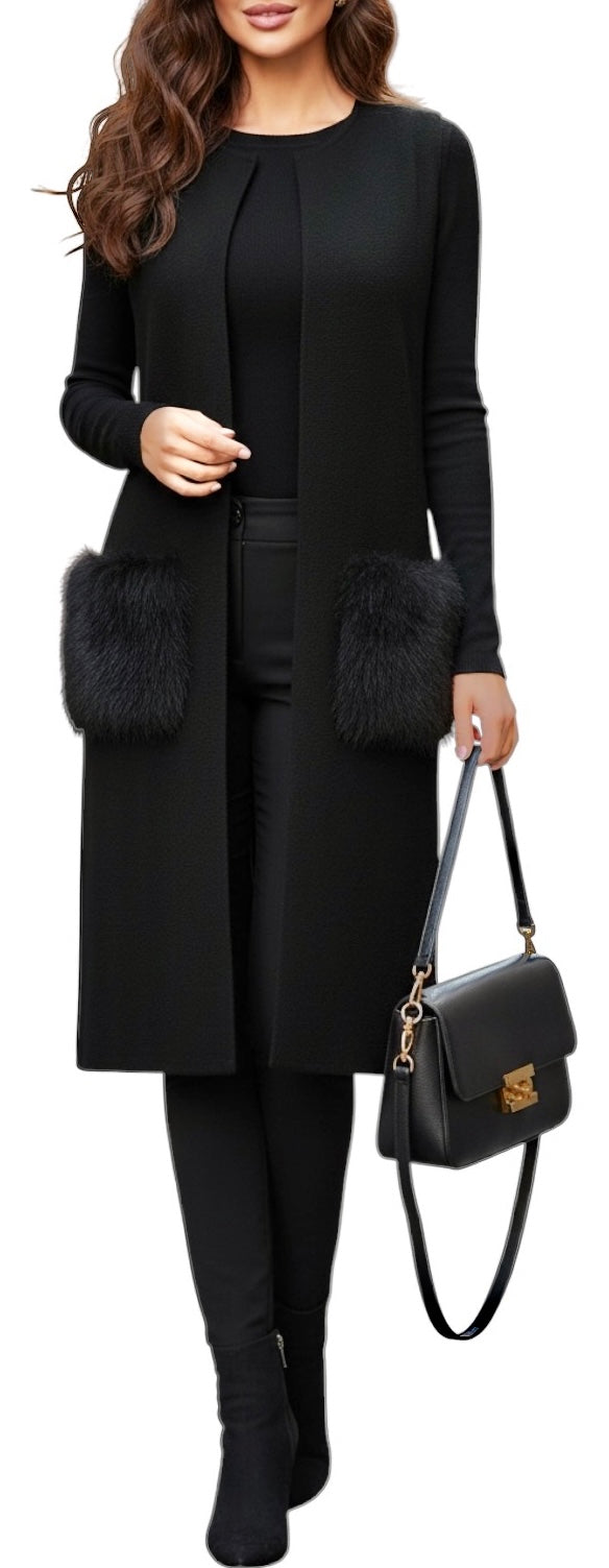 Dieser elegante Long-Cardigan ohne Ärmel vereint modernen Chic mit entspanntem Komfort. Seine offene, fließende Silhouette schmeichelt verschiedenen Körperformen und eignet sich dank der großzügigen Passform ideal für Größen 34 bis 44. Die weichen, dekorativen Felltaschen setzen einen stilvollen Akzent und verleihen dem Look eine besondere, luxuriöse Note.