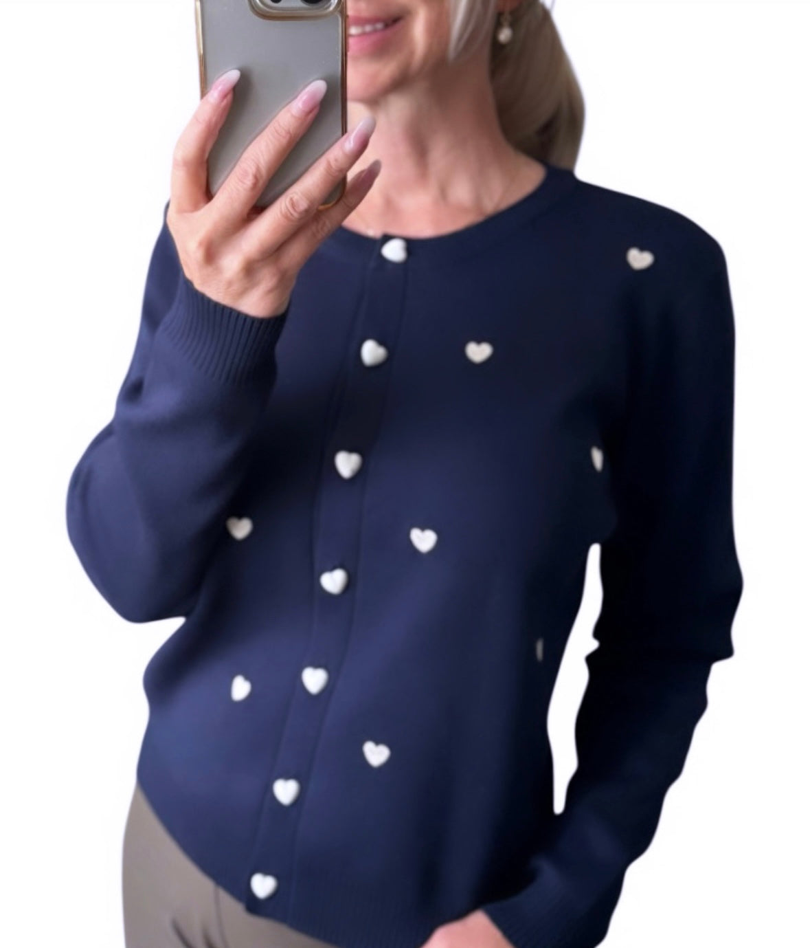 Süßer Cardigan in Dunkelblau mit weißen Herzknöpfen und kleinen Herzchen-Applikationen. Der weiche Strickmix sorgt für ein angenehmes Tragegefühl und passt sich wunderbar an verschiedene Größen an (Einheitsgröße geeignet für 34 bis 40).