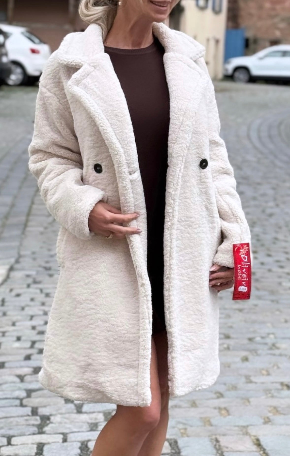 Dieser Mantel überzeugt durch sein weiches, wärmendes Material in Teddyfell-Optik und einen zeitlosen Schnitt. Mit klassischem Reverskragen, seitlichen Eingrifftaschen und einer verdeckten Knopfleiste lässt er sich sowohl lässig als auch elegant kombinieren. Perfekt für die kalte Jahreszeit, sorgt er für einen stilvollen Auftritt und angenehmen Tragekomfort.