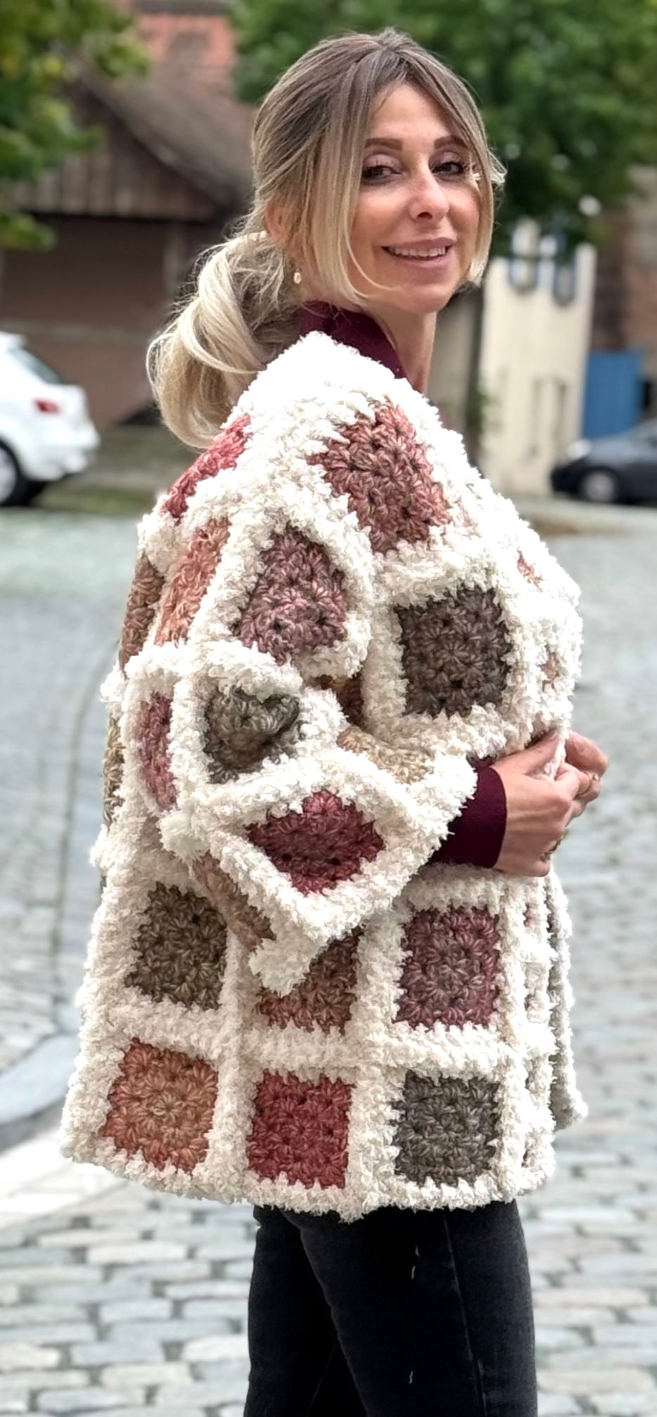 Diese wunderschöne Jacke im trendigen Patchwork-Häkel-Look ist ein echtes Highlight für kühle Tage. Die harmonisch aufeinander abgestimmten Farben und das weiche Material machen sie zu einem gemütlichen Begleiter für jeden Anlass.