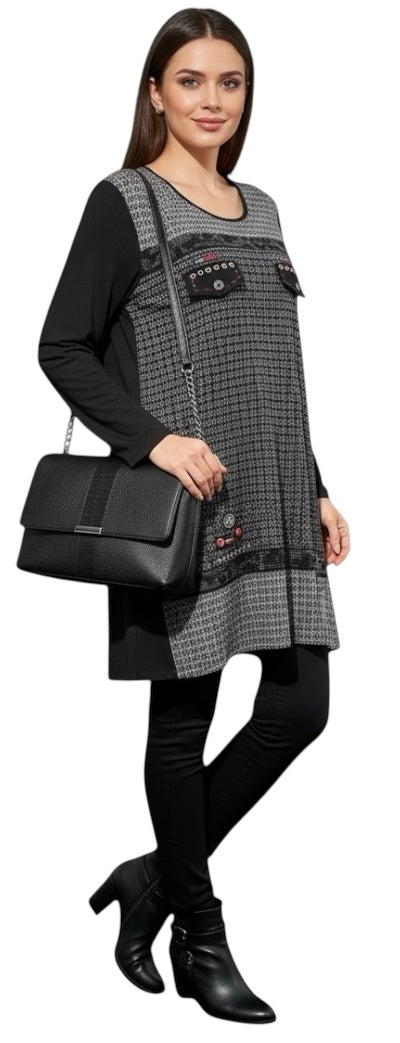 Dieses elegante Longshirt-Kleid kombiniert zeitlosen Print mit modernen Details. Das weiche, elastische Material sorgt für ein angenehmes Tragegefühl und eine schmeichelnde Passform. Die kontrastfarbenen Ärmel sowie dekorative Applikationen auf der Vorderseite verleihen dem Kleid einen besonderen, trendigen Look. Perfekt zu Leggings oder schmalen Hosen – ideal für Alltag, Büro oder City-Outfits.