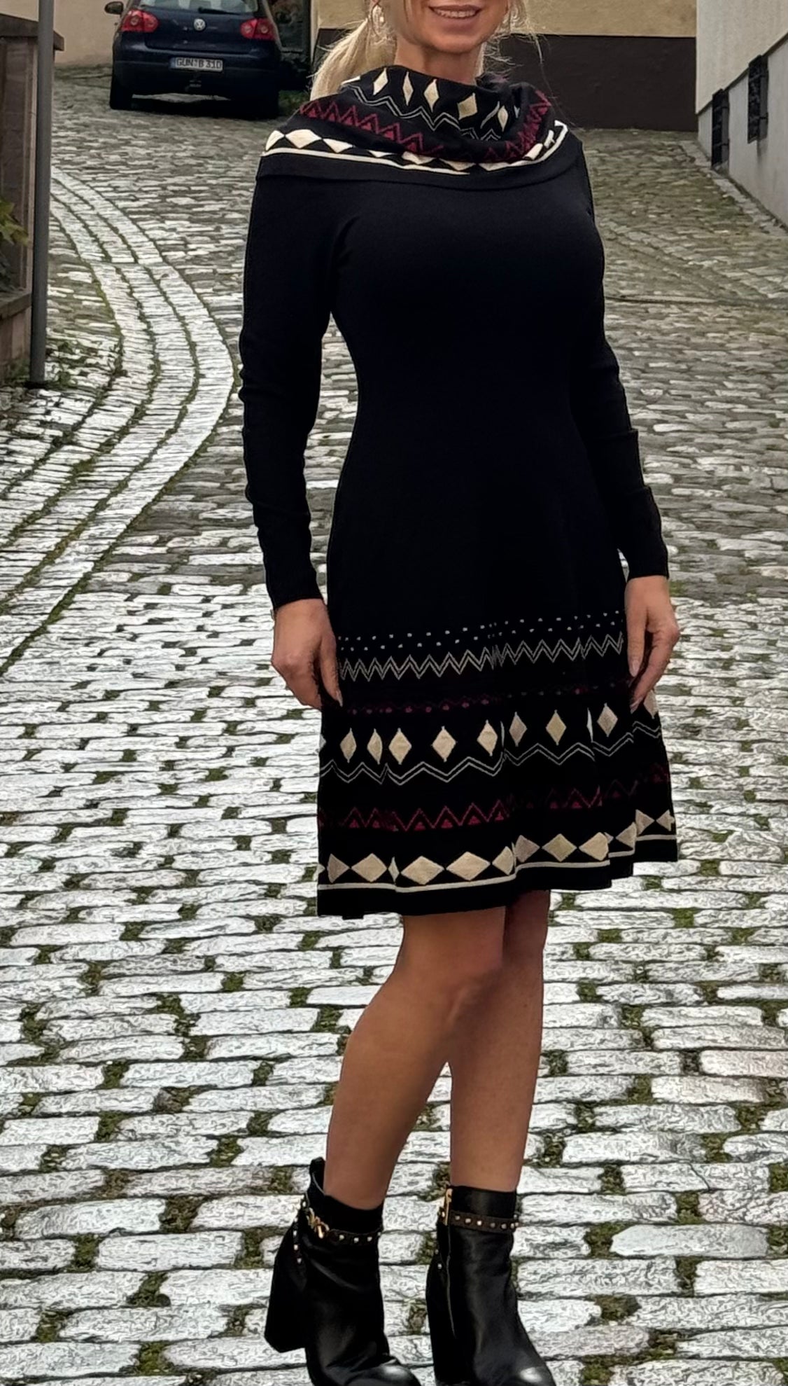 Das Kleid hat eine taillierte Silhouette, lange Ärmel und fällt durch das feine, angenehm elastische Strickmaterial besonders schön. Das Muster in kontrastierenden Farben sorgt für einen modernen, winterlich-eleganten Look.