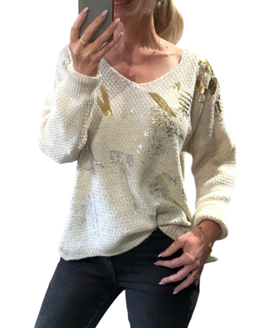 Ein trendiger, angenehm weicher Strickpullover mit auffälligem Glanzprint in Gold- und Silberoptik. Der Pullover hat einen bequemen, leicht oversized Schnitt mit V-Ausschnitt und langen Ärmeln – perfekt für einen modernen, lässigen Look.