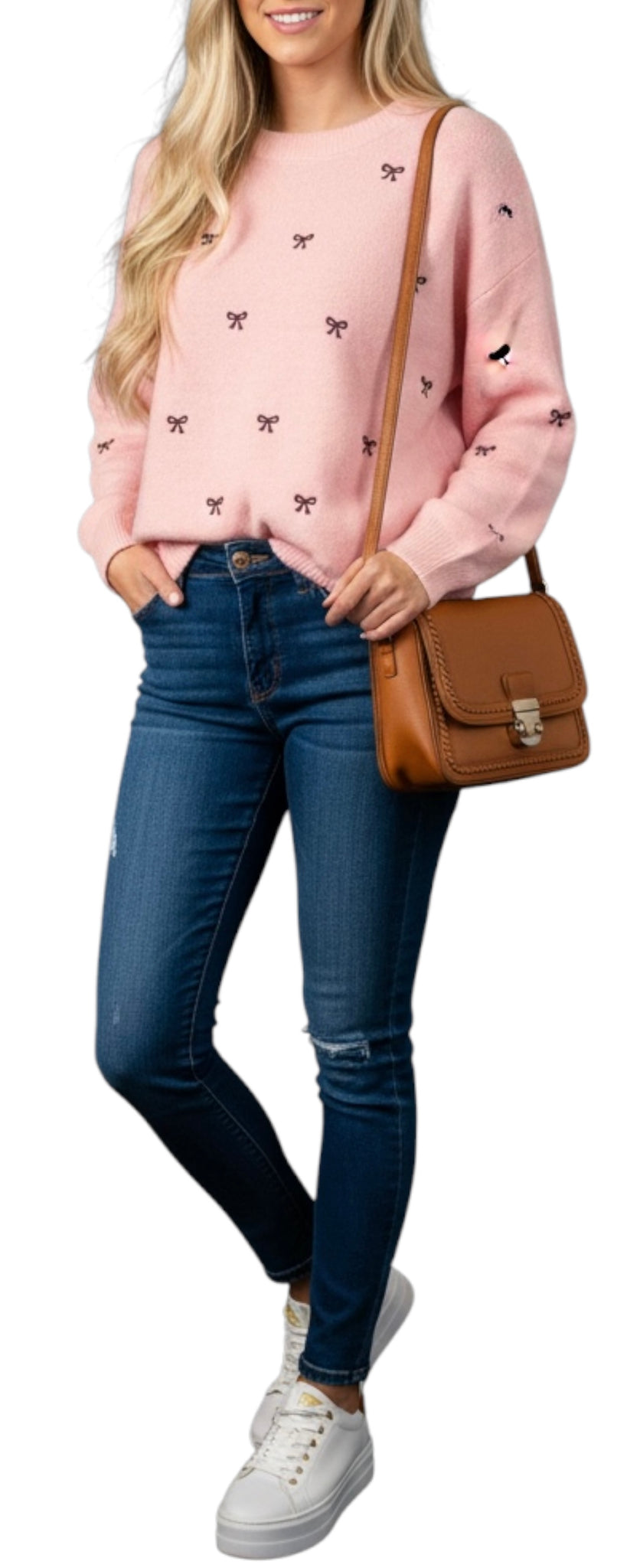 Süßer Strickpullover mit Schleifenstickerei – Rosa (Gr. 34–44)