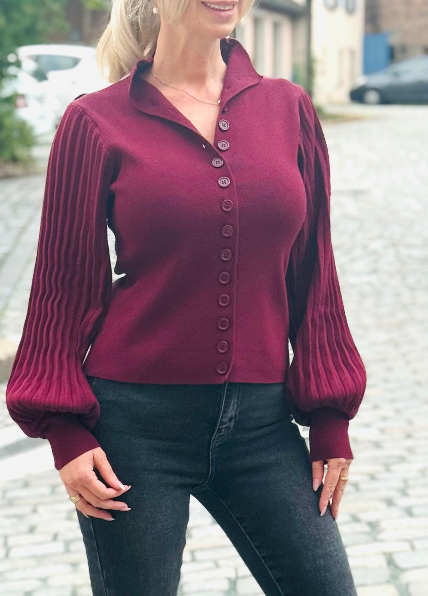 Dieser elegante Pullover ist ein echter Blickfang: Die besonderen Plissee-Details an den Ärmeln verleihen ihm eine edle Note, während der Stehkragen mit durchgehender Knopfleiste für einen modernen Look sorgt. Das weiche, elastische Material schmiegt sich angenehm an und bietet hohen Tragekomfort.