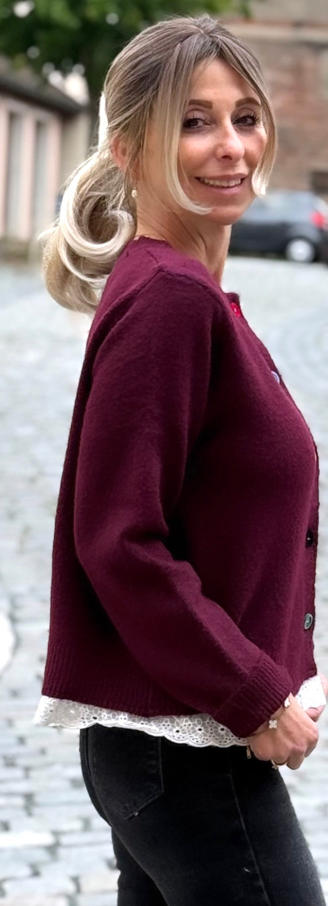 Diese verspielte Strickjacke in edlem Bordeaux-Rot ist ein echter Hingucker. Die bunten Knöpfe in Rot, Blau, Gelb, Schwarz und Grün verleihen ihr eine fröhliche Note, während die zarte Häkelspitze am Saum für einen femininen Akzent sorgt. Ein kleines, aufgesticktes Hunde-Motiv rundet den Look charmant ab.
