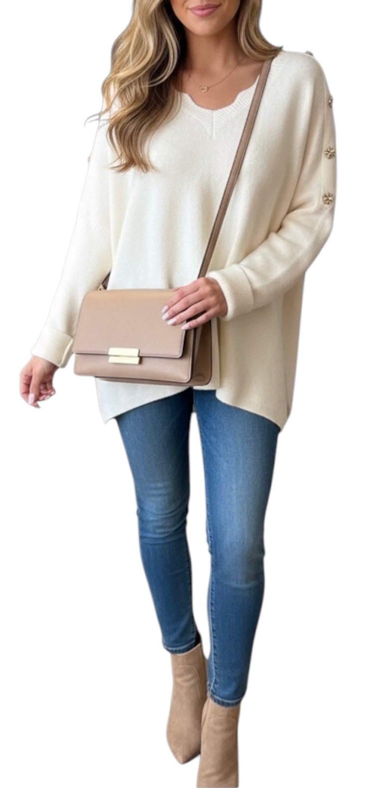 Weicher, oversized geschnittener Pullover mit dekorativen Knöpfen auf der Schulter. Der V-Ausschnitt und die seitlichen Schlitze sorgen für eine lässige, schmeichelhafte Passform. Perfekt für einen stilvollen Alltagslook!