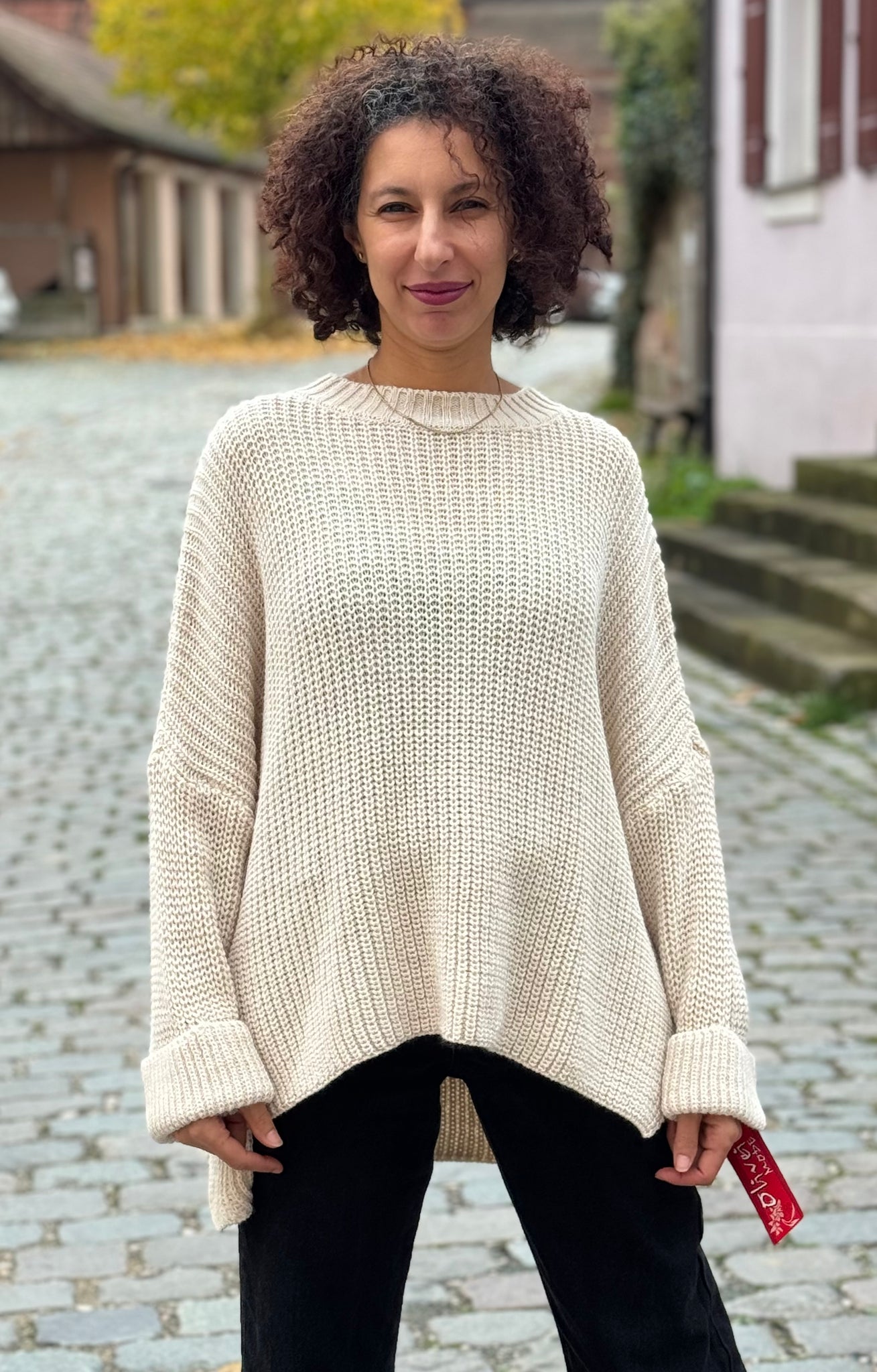 Der Pullover besteht aus 100 % Acryl, ist weich, formbeständig und lässt sich bei 30° in der Maschine waschen. Mit seiner grob gestrickten Struktur, den weiten Ärmeln und dem leicht verlängerten Rückenteil ist er ein echter Wohlfühl-Favorit für den Alltag.