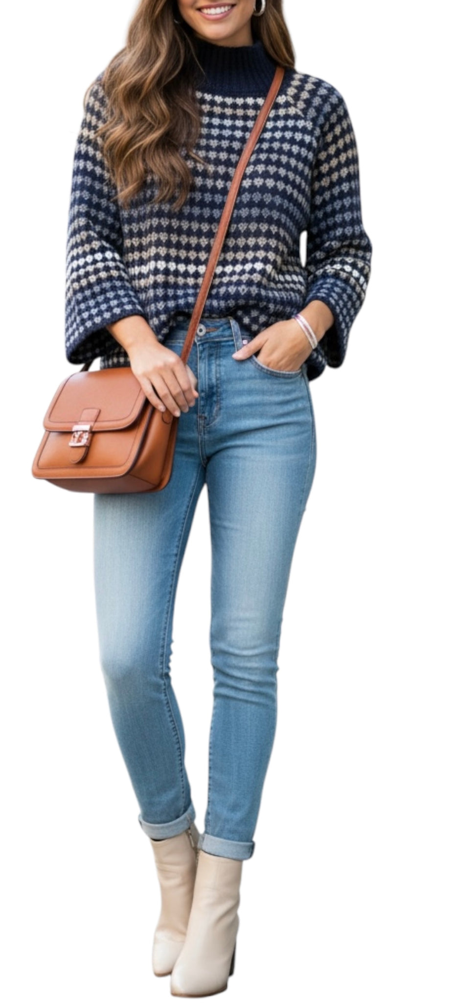 Dieser trendige Strickpullover im stilvollen Navy-Beige-Muster überzeugt mit seinem lockeren, schmeichelnden Schnitt und eignet sich perfekt für die kühleren Tage. Durch die komfortable Weite und die leicht ausgestellten Ärmel passt der Pullover Frauen von Größe 34 bis 46 – ohne aufzutragen und ohne die Bewegungsfreiheit einzuschränken.