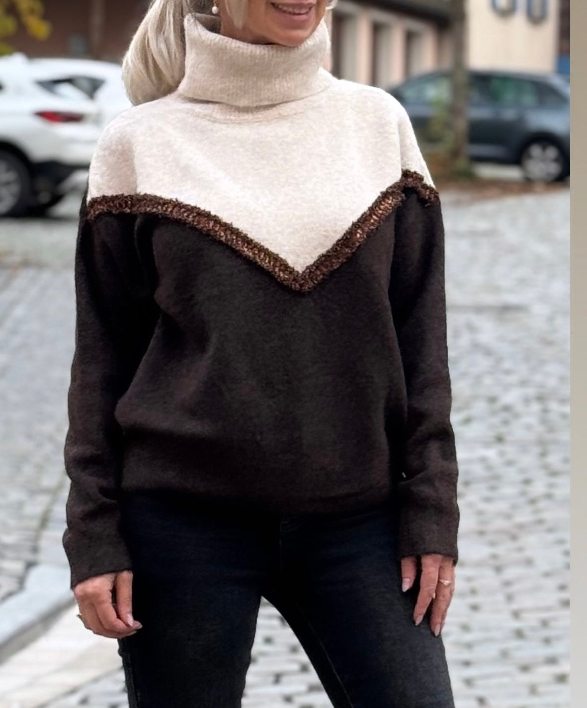 Stylisch, kuschelig und absolut cozy – dieser hochwertige Strickpullover ist ein echtes Must-have für die kühle Jahreszeit! Der weiche Rollkragen sorgt für Wärme und Komfort, während das zweifarbige Design mit V-Einsatz eine moderne, schmeichelhafte Silhouette zaubert.