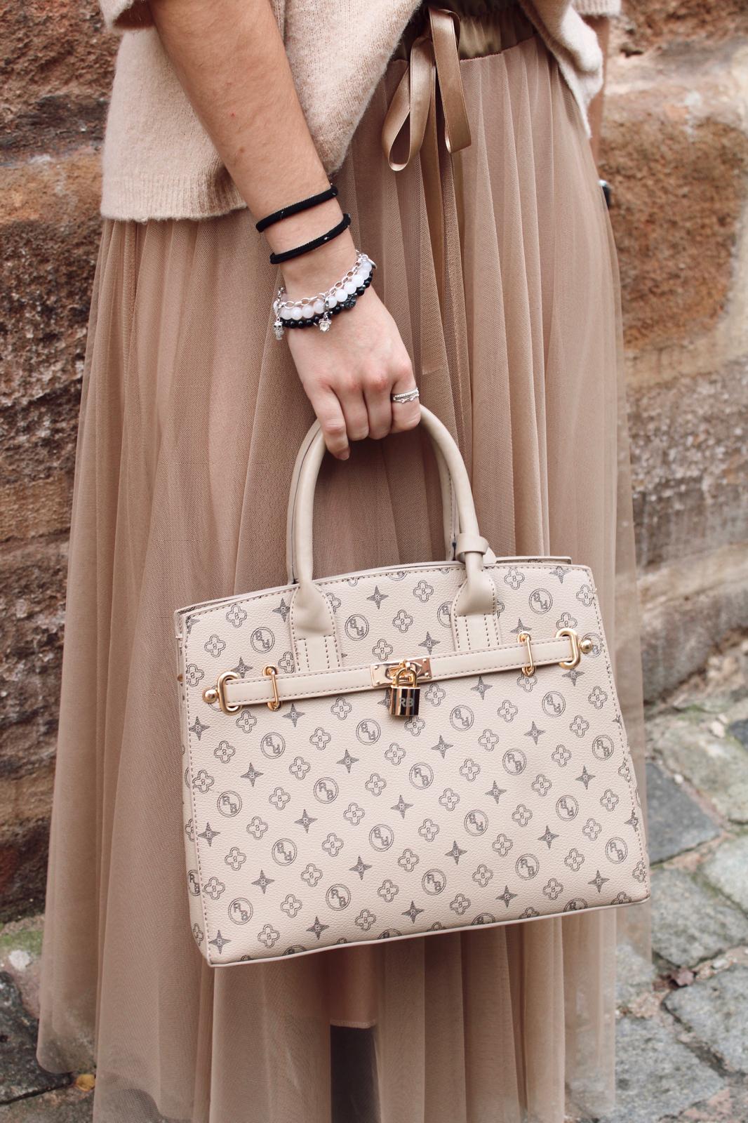 - Farben: Rosa, Schwarz, Beige, Taupe