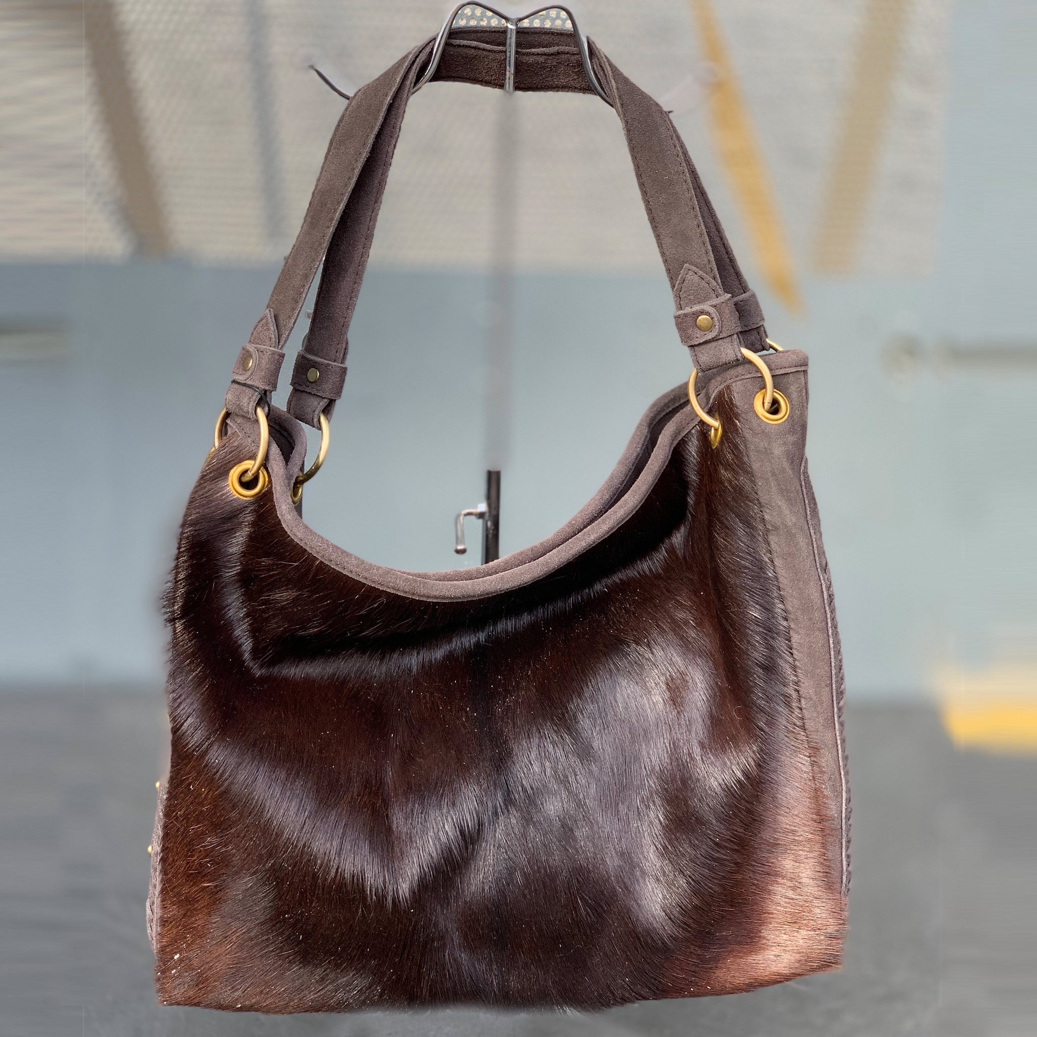 Angesagte Leder Tasche aus Leder mit Fell Einsatz. Die Tasche ist aufwendig gestaltet mit Nieten und mehreren Inntaschen. Die Tasche ist BHT ca. 40cm x 32cm x 14cm groß. Außenmaterial Veloursleder mit Fell (Rinderhaar) Innenfutter 100% Polyester