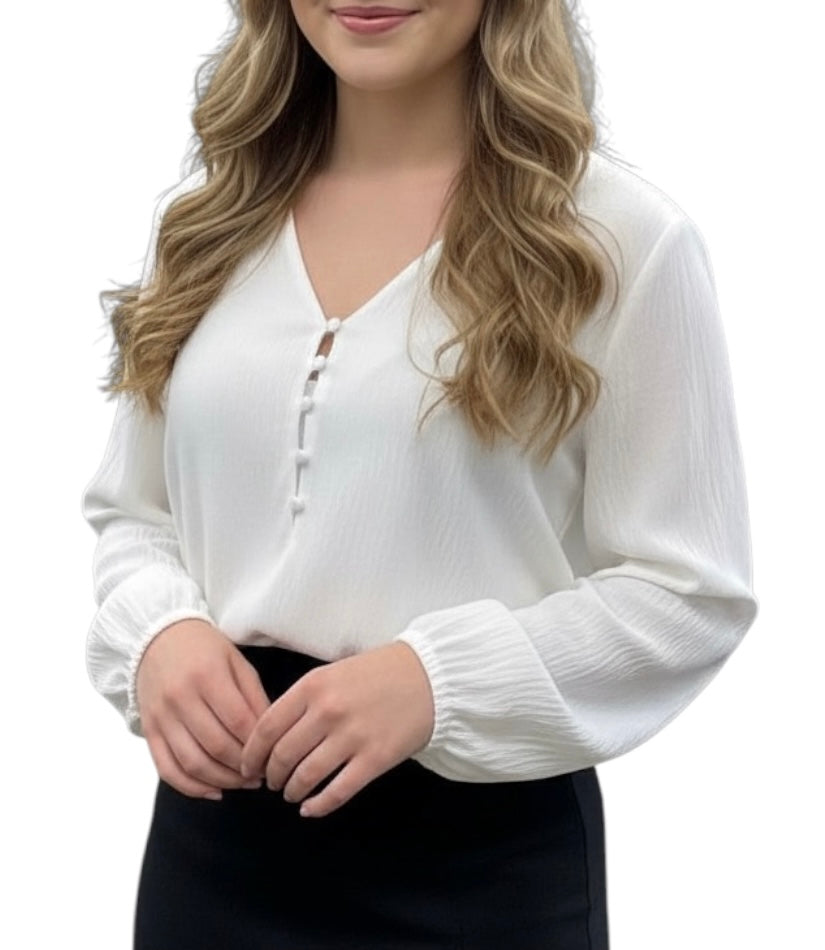 Diese feminine Bluse begeistert mit ihrem weich fließenden Stoff und einer zeitlosen, klaren Linienführung. Der dezente V-Ausschnitt mit dekorativen Knopfleisten-Details verleiht der Bluse eine elegante Note, während die leicht strukturiere Oberfläche dem Look zusätzliche Wertigkeit schenkt.