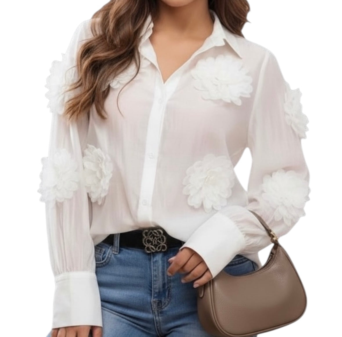 Elegante Bluse mit auffälligen, dreidimensionalen Blumenapplikationen, die dem Design eine feminine und zugleich moderne Note verleihen. Das leichte, weich fallende Material sorgt für ein angenehmes Tragegefühl, während die klassische Knopfleiste und der Kragen der Bluse einen stilvollen Look geben. Die weiten Manschetten setzen zusätzliche Akzente und runden das Gesamtbild harmonisch ab.