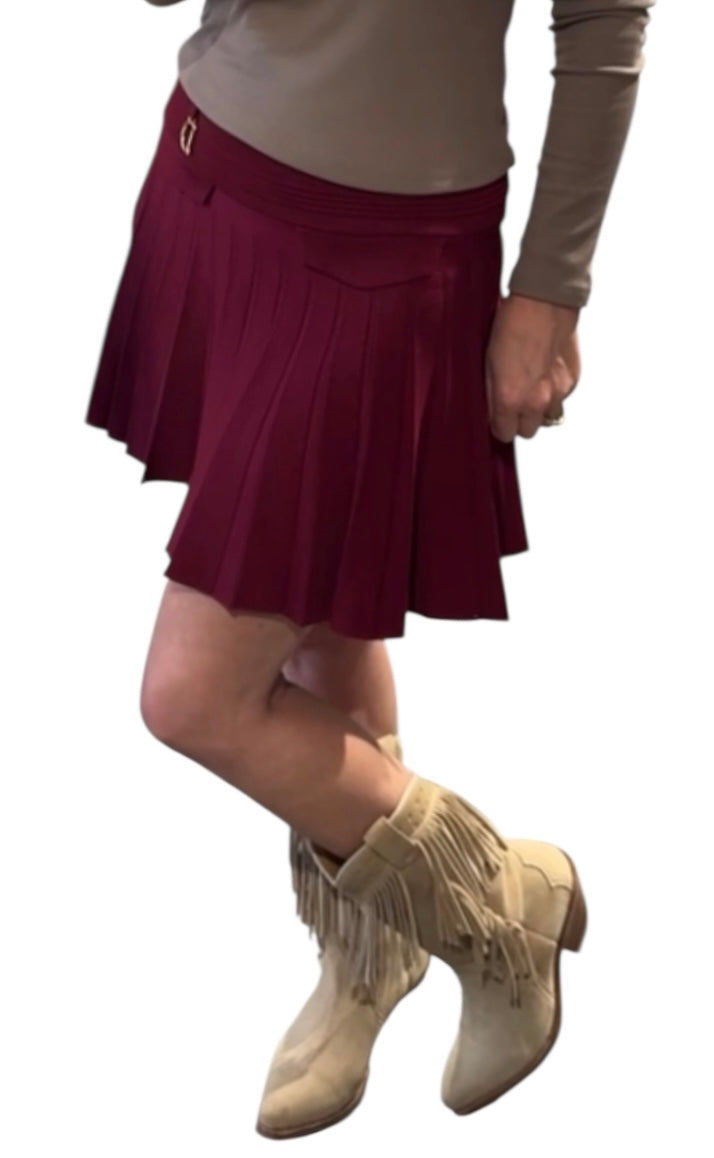 Stylischer Mini-Faltenrock mit femininer Silhouette und modischem Ziergürtel-Detail in D-Form. Der Rock ist aus einem angenehm weichen, elastischen Stoff gefertigt und bietet durch seinen Stretchbund hohen Tragekomfort.